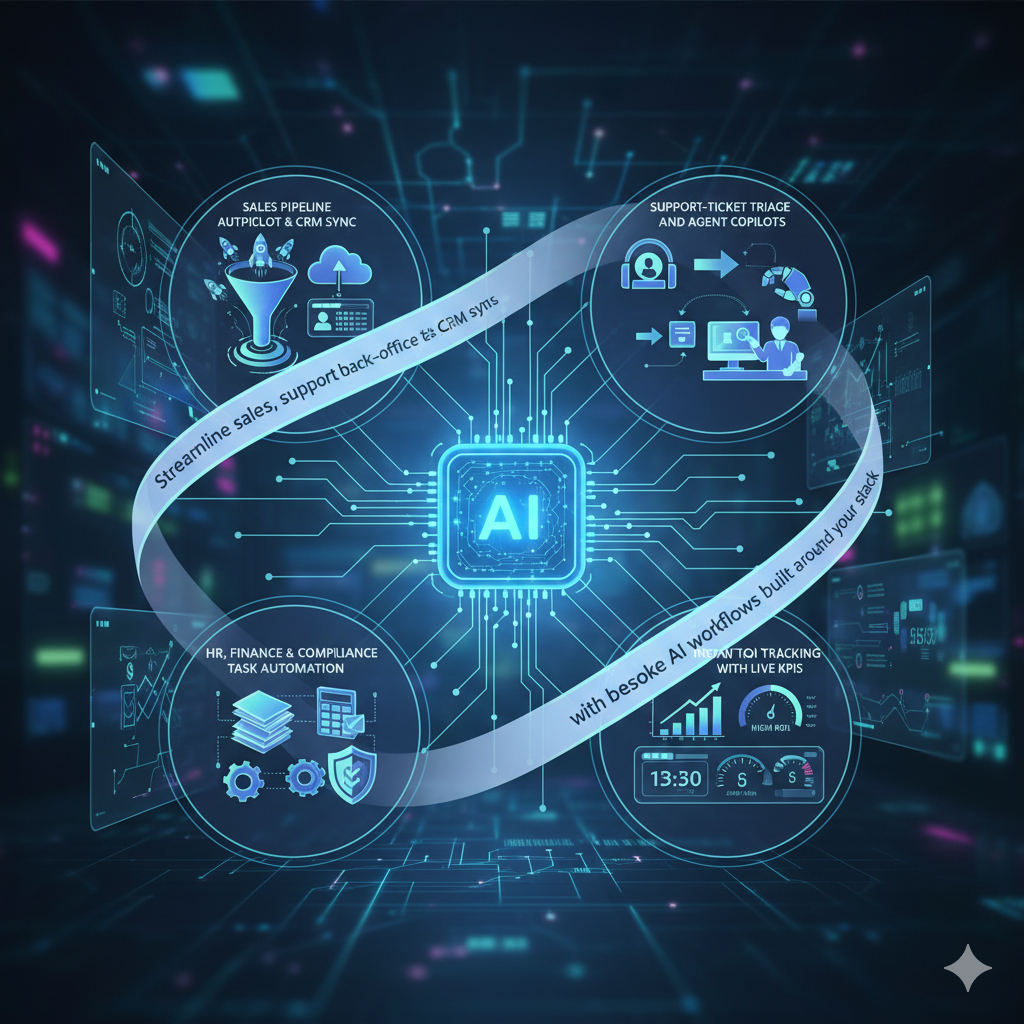 Streamline sales, support and back-office tasks with bespoke AI workflows built around your stack.